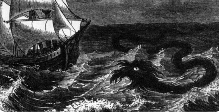 Гравюра изображающая, как на Марию Селесту нападает морской змей