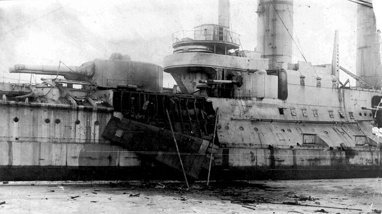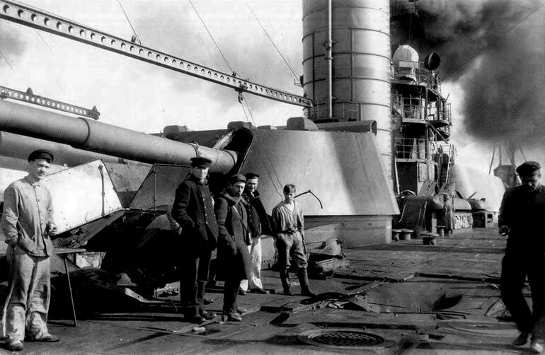 Восставший броненосец "Гражданин" (бывший "Цесаревич") после обстрела с форта "Красная Горка". Интересно, что двумя годами ранее антибольшевицкое восстание вспыхнуло на этом форте, а броненосец участвовал в его подавлении.