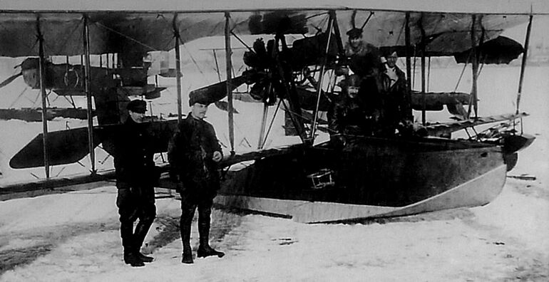 Экипаж летающей лодки М-20, участвовавший в бомбардировках Кронштадта. Слева на заднем плане виден трофейный английский гидросамолет "Фэйри" F-3, с которого была сброшена бомба, поразившая "Петропавловск".