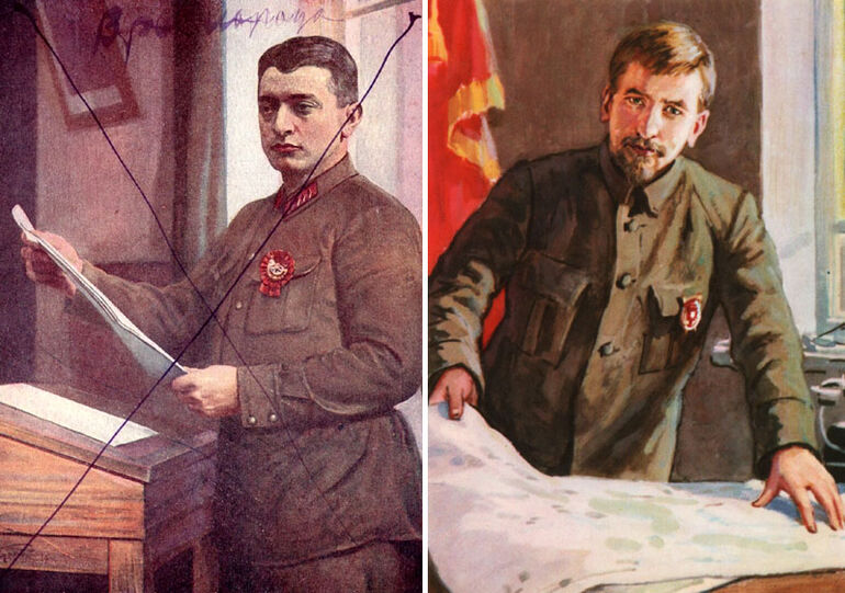 Слева — открытка 1932 года "Член Реввоенсовета товарищ Тухачевский". Изображение перечеркнуто, а сверху фиолетовыми чернилами написано "Враг народа". Во время подавления Кронштадтского восстания Тухачевский командовал 7-й армией. Расстрелян 12 июня 1937 года.