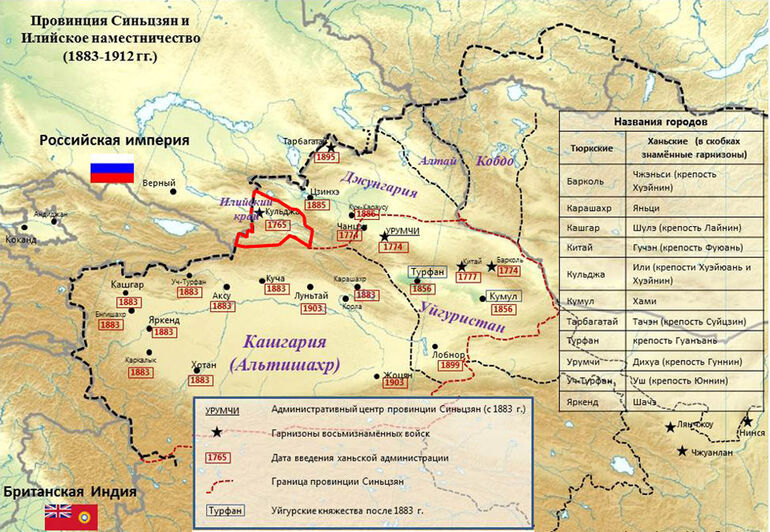 Илийский край был завоеван в 1871 году, но вскоре на него предъявил права Китай, ссылаясь на то, что он обладал этими землями еще в 18 веке и временно утратил над ними контроль в результате уйгурско-дунганского восстания 1864 года. После долгих переговоров Россия согласилась передать Илийский район Китаю за солидное вознаграждение и гарантию беспрепятственной деятельности там русских купцов.