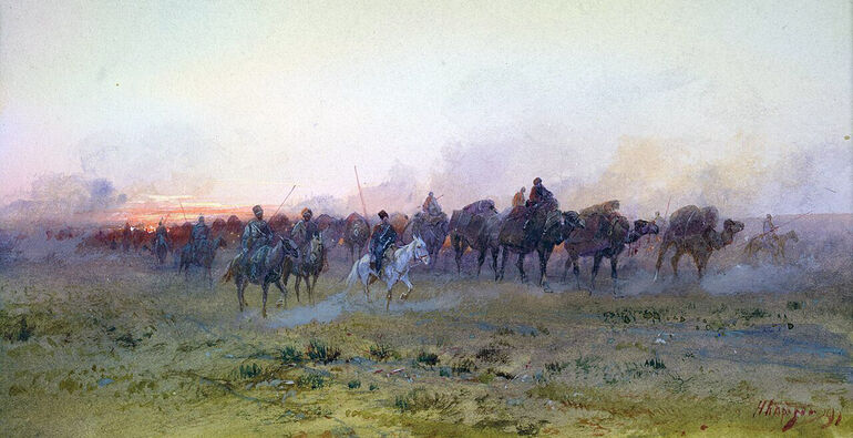 Уйгурский верблюжий караван под охраной казаков уходит с проданных земель в Россию. Картина Николая Каразина.