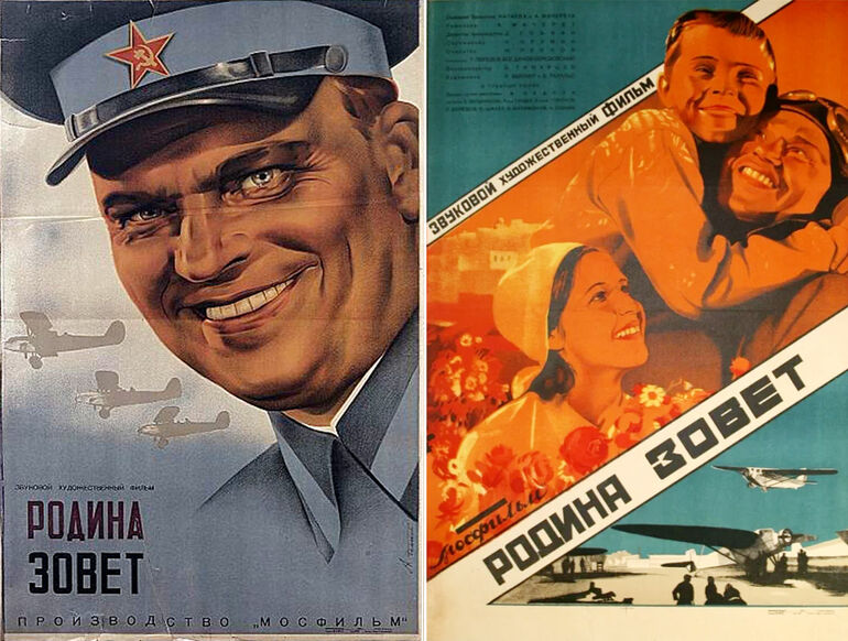 Впервые эта сценарная "болванка" была опробована в фильме "Родина зовет", посвященном советским летчикам, которые сперва испытывают лучшие в мире крылатые машины, потом ставят на них рекорды, а потом — громят в воздушном сражении вражеские тяжелые бомбардировщики, которые, что интересно, в точности копируют советские ТБ-3, только с огромными свастиками на крыльях. Непонятно, чем это можно объяснить (тем более, что "родные" ТБ-3 со звездами в картине тоже присутствуют). Возможно, авторы фильма просто не знали, как выглядят иностранные бомберы, поэтому использовали знакомый образец.