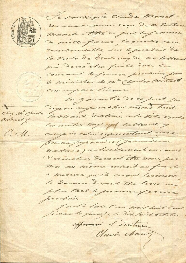 В расписке художник подтверждает получение займа в 1000 франков от Гюстава Мане - брата художника Эдуара Мане.