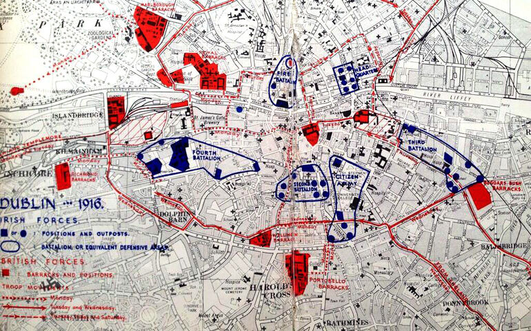 Карта Дублинского восстания. Красным показаны места сосредоточения и пути наступления английских войск, синим — опорные пункты ирландских повстанцев.