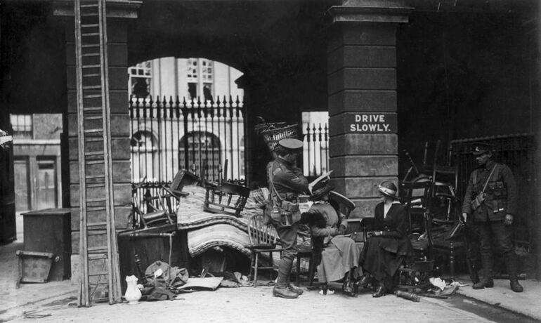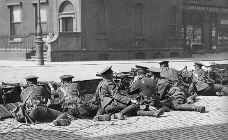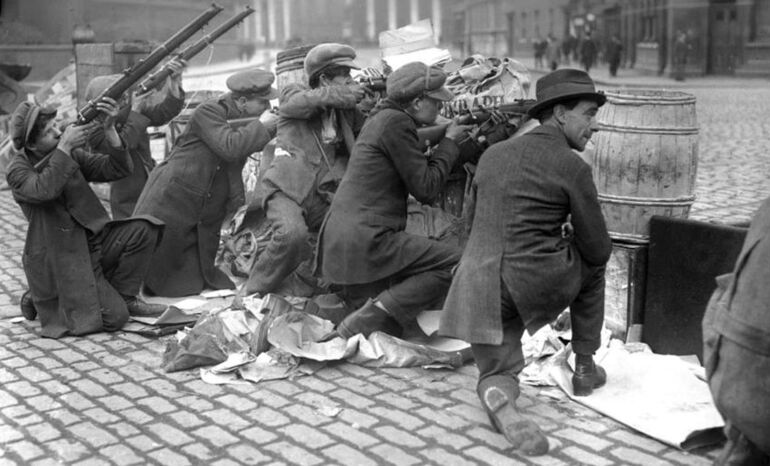 На заставке — повстанцы обороняют здание Главпочтамта, в котором они устроили свой штаб и госпиталь. Им удалось отбить несколько атак, после чего англичане начали артиллерийский обстрел, вынудивший ирландцев отступить.