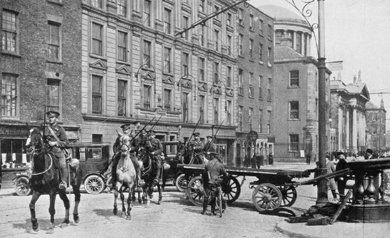 Британские лэнсеры на улице ирландской столицы. В первый день восстания попытка атаковать в конном строю с пиками наперевес закончилась для них весьма плачевно. Атаки пехоты также были отбиты, после чего в дело вступила артиллерия.