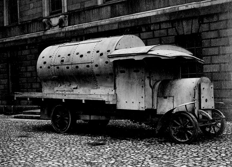 Позже сделали еще два "бронетранспортера", один из которых был аналогичен первому, а второй имел более вместительный кузов прямоугольной формы. Обратите внимание, что у этих бронеавтомобилей только часть бойниц — реальна, а остальные — нарисованы, чтобы вводить в заблуждение вражеских снайперов. После подавления восстания грузовики разбронировали и вернули владельцам.