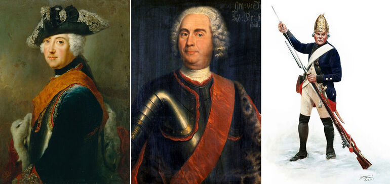 Молодой Фридрих (портрет 1741 года), фельдмаршал фон Швеин — настоящий победитель в битве при Мольвице и прусский гренадер в обмундировании времен войны за австрийское наследство зарчяжает потсдамский мушкет с помощью стального шомпола.