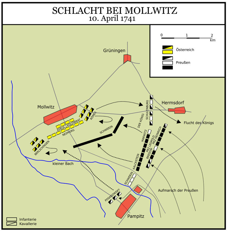 В битве прусаков с австрияками у силезского городка Мольвиц прусаки, имевшие численное превосходство (особенно значительное — в артиллерии: 53 орудия против 19), одержали победу, заставив противника отступить. Но, во-первых, эта победа досталась им очень дорого — прусские потери были выше австрийских, в во-вторых, сам Фридрих не имел к этой победе никакого отношения, поскольку его поведение во время боя иначе как глупым и позорным не назовешь.