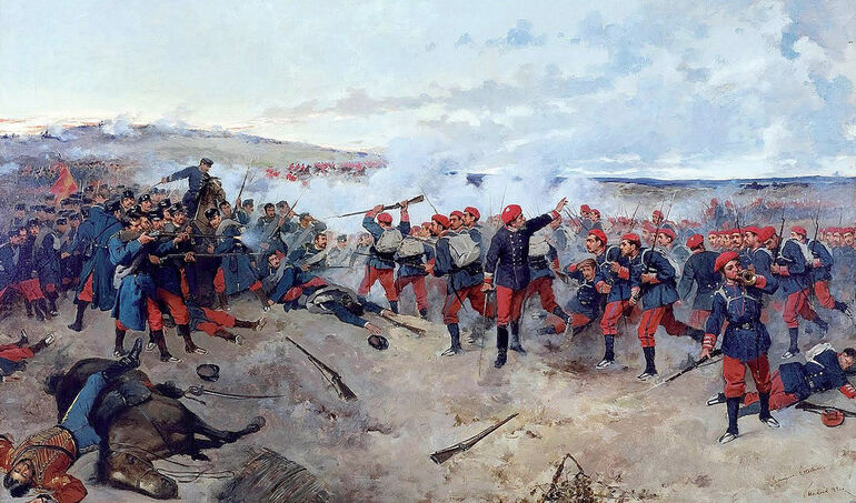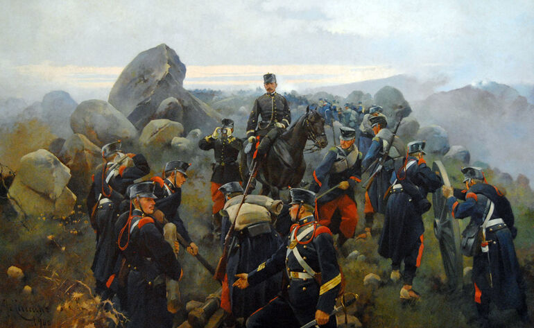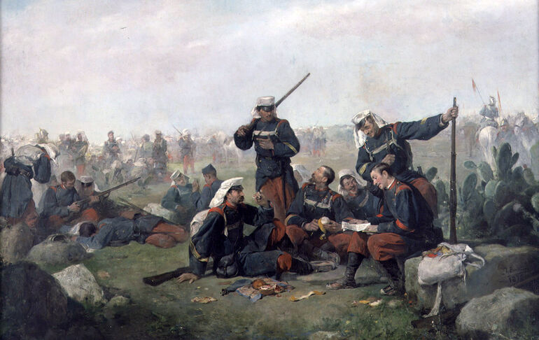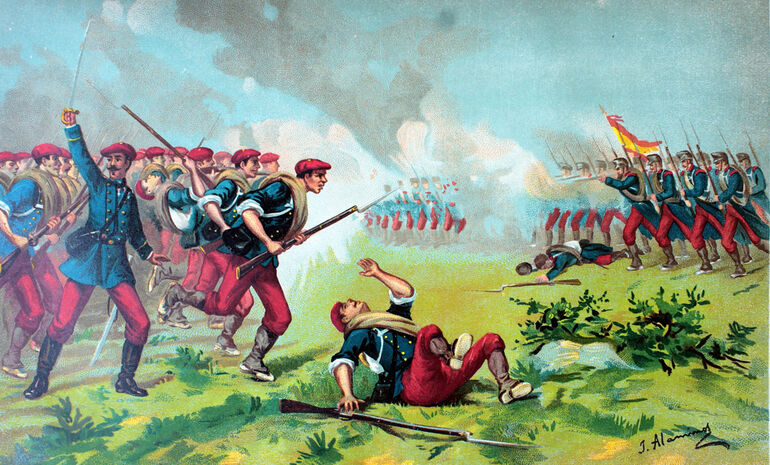 Битва при Лакаре 3 февраля 1875 года. В этом бою альфонсисты (они слева) потерпели поражение, потеряв до 1000 человек убитыми и пропавшими без вести.