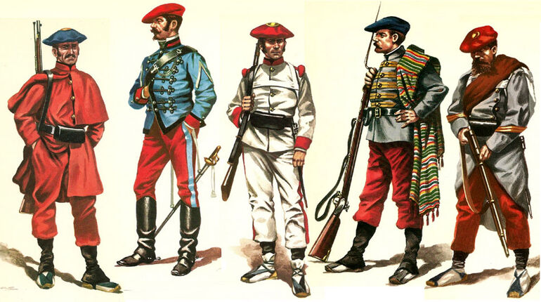 Сражение карлистов с альфонсистами за Санта Барбару в 1875 году. Как видите, обе враждующие армии одеты в мундиры одинаковой расцветки, скопированной у французов. Разница лишь в головных уборах. Традиционным отличительным знаком карлистов, вне зависимости от рода войск, был большой берет, похожий на гриб. Почти всегда он был красным (такой носил и сам дон Карлос), но в некоторых батальонах — синим или черным. Альфонсисты же носили высокие черные кепи.