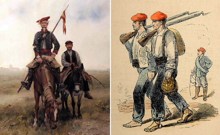 Слева: известный персонаж классической испанской литературы, нарисованный в образе карлиста. Справа: ополченцы дона Карлоса, которые зачастую вообще не имели военной формы и даже обуви, а единственным признаком их принадлежности к движению был "фирменный" красный берет.