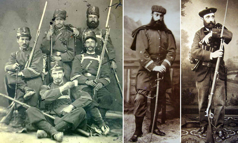 Слева — направо: группа солдат армии Альфонсо XII, команданте карлистской армии Пруденсио Арнао и солдат 3-го пехотного батальона карлистов.