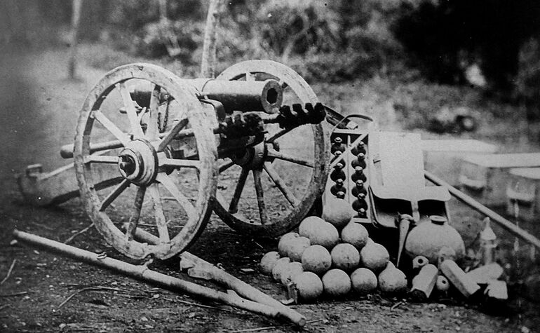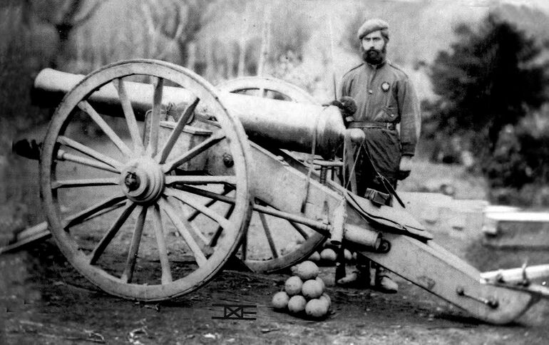 Артиллерийские орудия карлистов. Обратите внимание на гексагональную форму канала ствола пушки Уитворта на верхнем фотоснимке. Специальные граненые снаряды для нее сложены в правом нижнем углу.