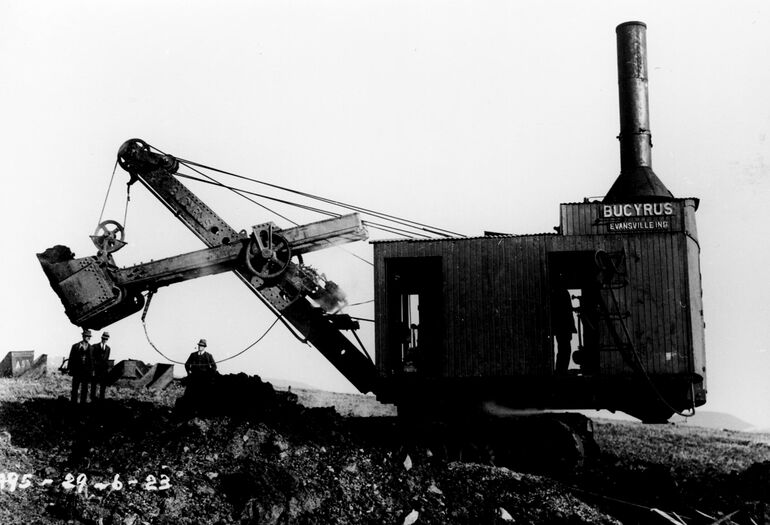 В начале XX века "Бьюсайрус наладил производство не только рельсовых, но и гусеничных экскаваторов с тросовыми приводами, но по-прежнему на паровой тяге. Этот снимок датирован 29-м июня 1923 года.