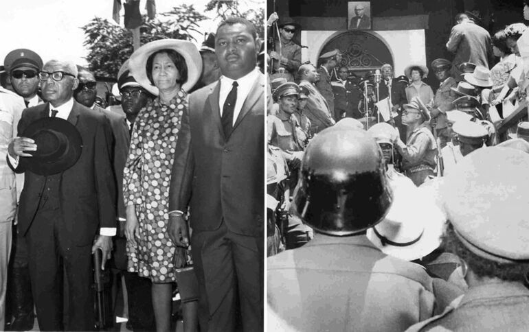 Слева — Папа Док с женой и наследником. Обратите внимание, что в левой руке он держит автомат, с которым никогда не расставался, покидая свою резиденцию (что-то мне это ). Справа — он же выступает перед микрофоном под собственным портретом.