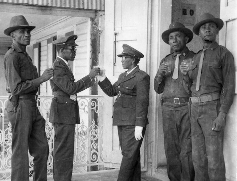 Какая-то вечеринка тонтон-макутов. В центре — комендантша центральной политической тюрьмы Гаити мадам Розали Аугуста, она же Розали Боске, она же Макс Адольф. Последнее мужское имя она придумала себе сама и предпочитала, чтобы в общении с ней все употребляли именно его. По рассказам, эта маленькая женщина с явными гендерными отклонениями отличалась невероятным садизмом и лично замучила около двух тысяч человек, постоянно изобретая различные изощренные пытки.