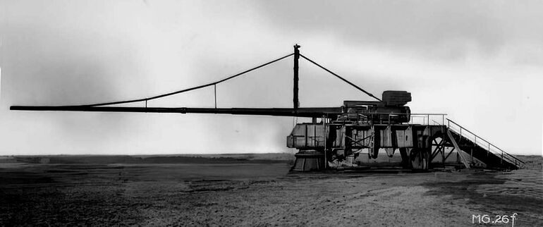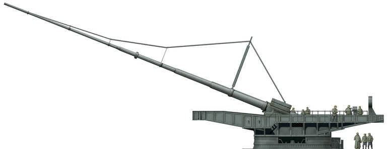 "Колоссаль" во время полигонных испытаний на севере Германии в 1917 году. Ствол установлен в горизонтальное положение для заряжания. Перед выстрелом на максимальную дистанцию он поднимался на угол в 55 градусов. Обратите внимание на противовес из бетонных блоков, укрепленный на казеннике для компенсации массы ствола, который весил 138 тонн.