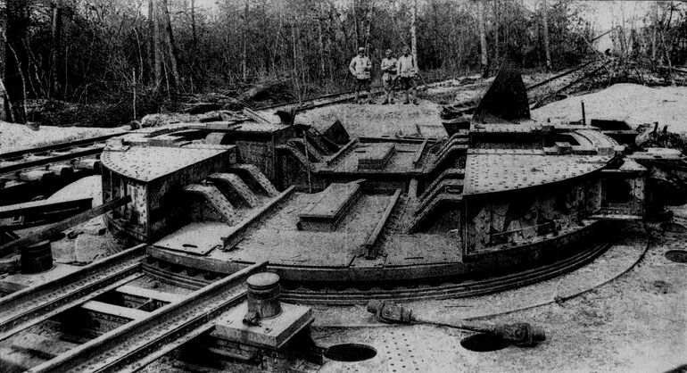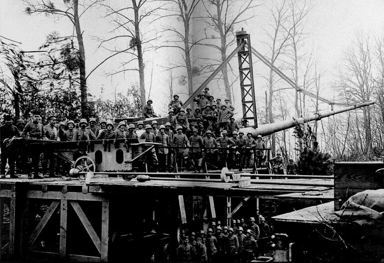 "Колоссаль" и его расчет, состоявший из 80 морских артиллеристов, на боевой позиции в лесу под Шато-Тьери. Орудие вело огонь в течение четырех месяцев, но, как ни странно, за всё это время многочисленная французская и английская разведывательная авиация, которая насчитывала сотни самолетов, так и не смогла обнаружить столь огромное сооружение. Это вдвойне загадочно, так как его огневая позиция располагалась всего в 10 километрах от линии фронта.