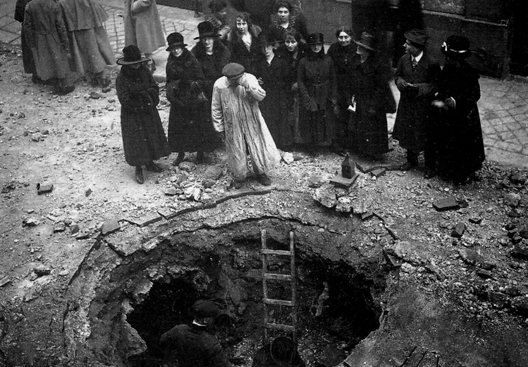 Парижане возле воронки от снаряда "Колоссаля", пробившего мостовую до подземных коммуникаций.