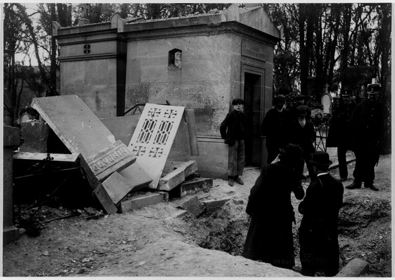Еще одна воронка и поваленные могильные плиты на кладбище "Пер-Лашез".