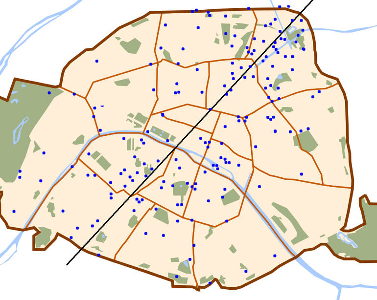 Схема мест падения снарядов "Колоссаля". Как видно, больше всего пострадали центральные и северо-восточные районы Парижа. Черная диагональ — линия огня.