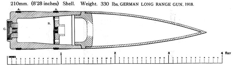 Конструкция снаряда, который для надежности был оснащен двумя взрывателями - донным и внутренним диафрагменным, а также - двумя ведущими поясками с заранее сделанными проточками под нарезы. Износ ствола при стрельбе был столь велик, что каждый снаряд приходилось делать больше по диаметру, чем предыдущий, поэтому все боеприпасы были строго индивидуальны и имели порядковые номера. Нарушение последовательности номеров при стрельбе категорически запрещалось, так как это могло разорвать ствол. А после каждых 65 выстрелов лейнер ствола требовал замены.