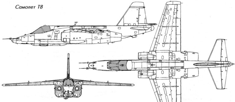 Чертеж Т8-1. Как видите, у него более кортокий киль, чем у серийных машин, а на крыле отсутствуют аэродинамические тормоза и пилоны подвески вооружения. Под днищем фюзеляжа заметен наружный пушечный контейнер. В дальнейшем пушку убрали в фюзеляж.