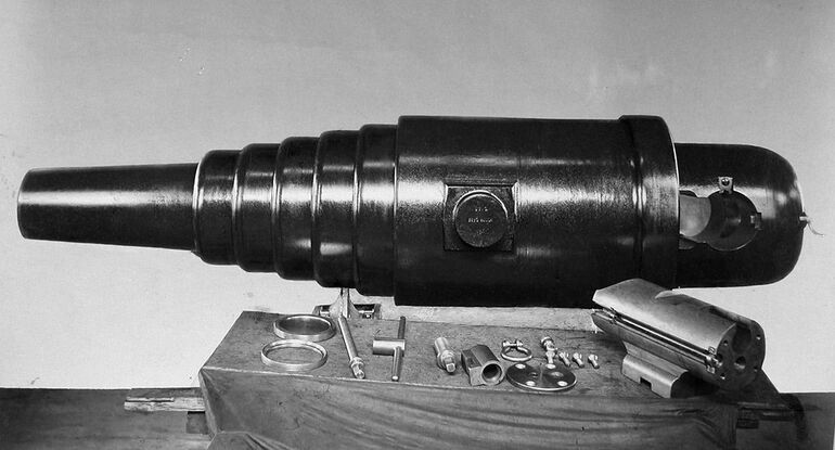 Десятидюймовое чугунное казнозаряядное орудие с извлеченным затвором.