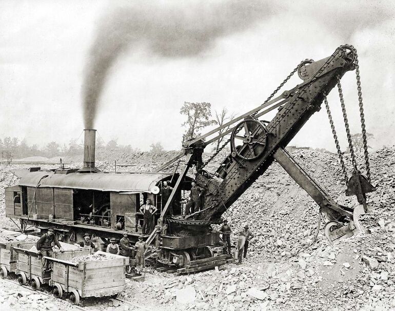 Паровой экскаватор "Бьюсайрус-Путиловец" на железнодорожном ходу с ковшом на 3,2 кубометра грунта.