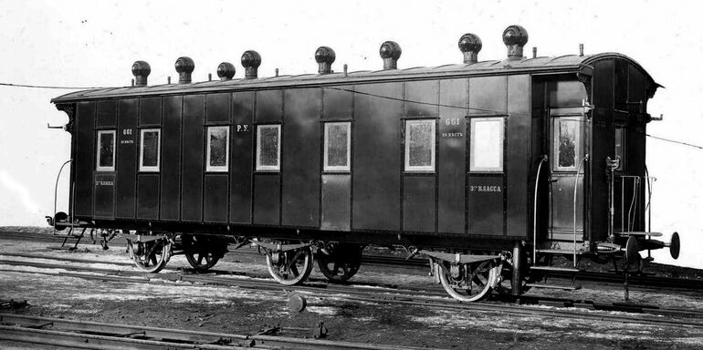 Трехосный пассажирский вагон 3-го классса Рязанско-Уральской железной дороги.