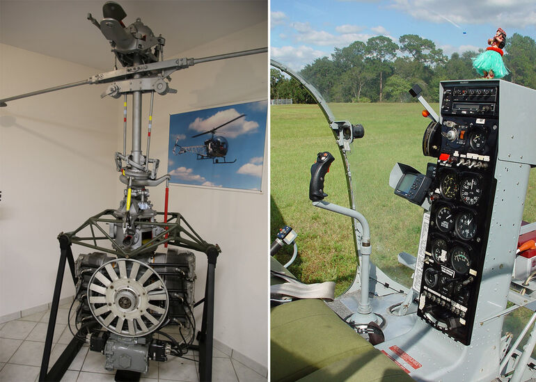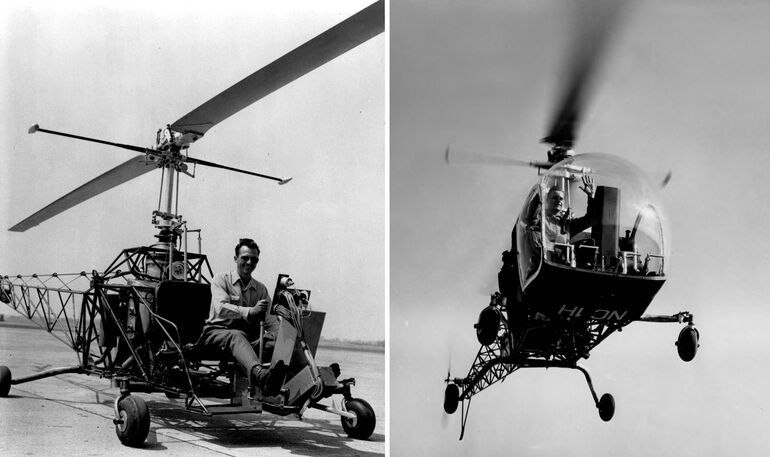 Первый прототип "Белла-47" не имел закрытой кабины, но на второй летный образец с заводским индексом NC1Н установили плексиглассовый "шарик" с дверцами, ставший отличительным признаком большинства вертолетов этой марки. Обратите внимание, что обе машины имели четырехколесное шасси. На правом фото в пилотском кресле — сам разработчик машины Артур Янг. Чтобы доказать ее устойчивость и безопасность он демонстративно отпустил ручку управления и снял ноги с педалей.