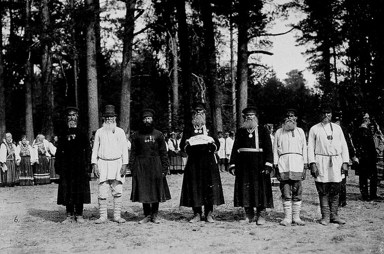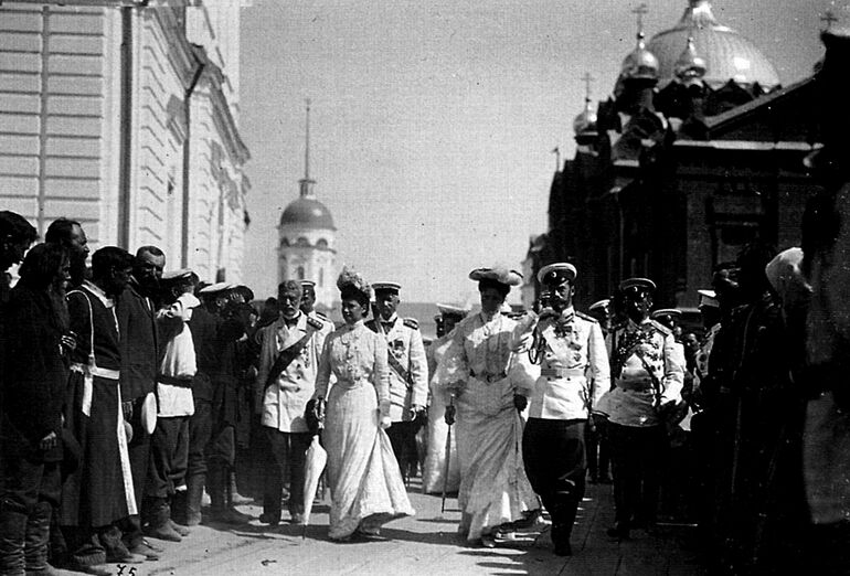 Почетные граждане Сарова в 1903 году готовятся преподнести хлеб-соль прибывающему в город на богомолье царю Николаю Второму. Поклонникам РКМП следует обратить внимание на то, что даже ради столь знаменательного события двое из них так и не смогли позволить себе сапоги, да и у остальных обувка не блещет.