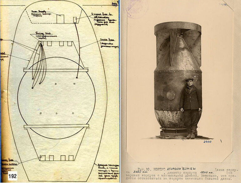 Доставленная по разведывательным каналам из США схема американской атомной бомбы Fat Boy, ставшей прообразом для изделия РДС-1, и габаритно-весовой макет для отработки аэродинамической формы первого советского ядерного боеприпаса.