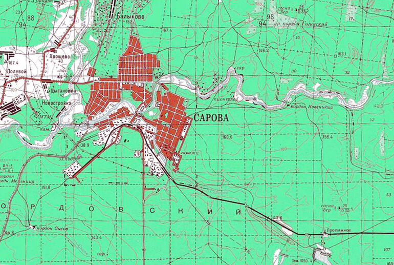 Интересно, что на военно-топографических картах, считавшихся секретными, Саров остался, но почему-то "сменил пол" с мужского на женский и стал называться "Сарова". Однако даже на этих секретных планах ядерный комплекс и все сопутствующие объекты отсутствовали! Места их расположения картографы по указанию спецслужб закрашивали таким же нежно-зеленым цветом, как и окрестные леса (см. внизу).