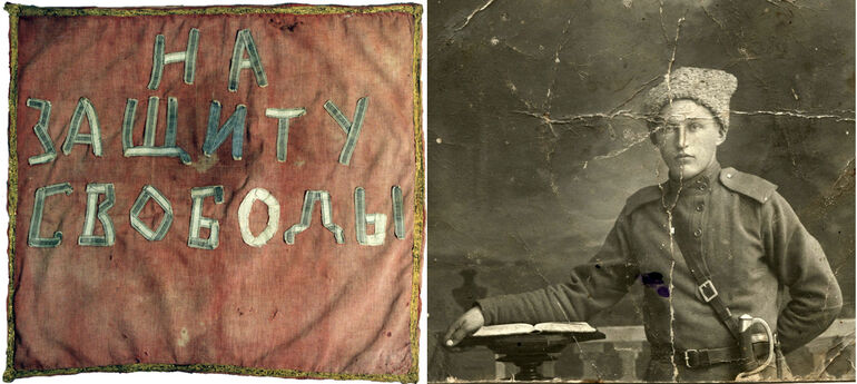 Слева — трофейное знамя ишимских повстанцев из фондов Центрального музея Вооруженых сил. Справа — дореволюционный фотопортрет Григория Атаманова, впоследствии возглавившего один из повстанческих отрядов.