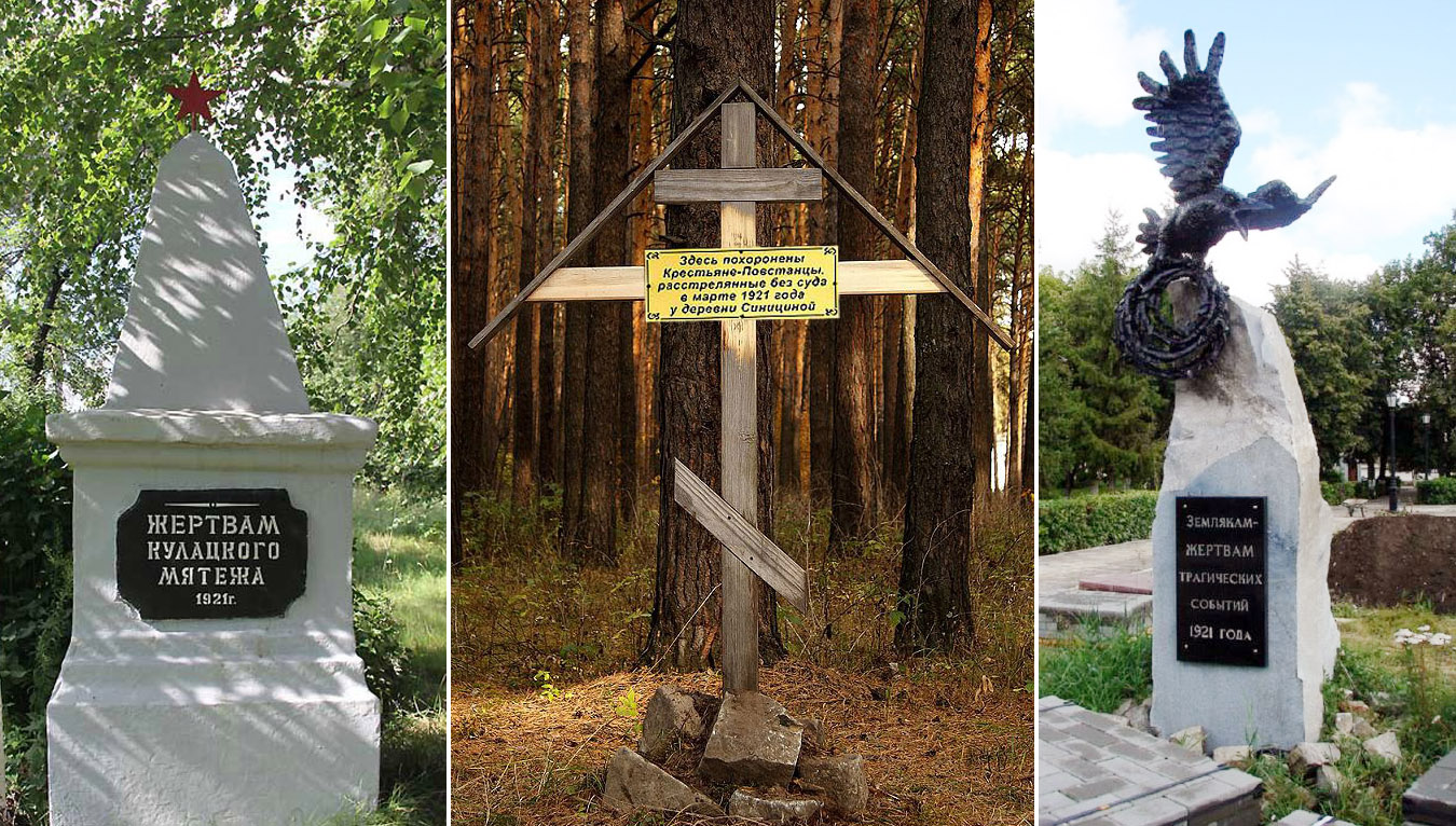 На заставке — памятники участникам событий с обеих сторон. Левый стоит еще с довоенных времен, центральный поклонный крест появился совсем недавно, а правый и довольно странный памятник "жертвам трагических событий 1921 года" в виде вороны, сидящей на мотке колючей проволоки, был установлен на городском кладбище Ишима в 2011 году.