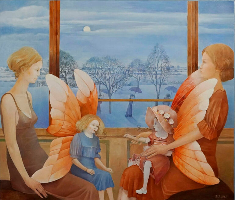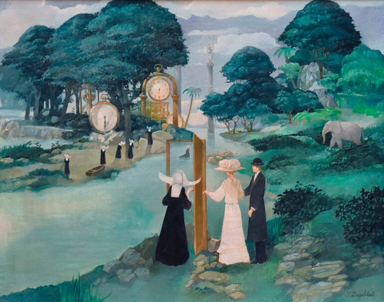Люди в викторианских костюмах и монахиня стоят перед открытой дверью, открывающейся в ландшафт с гигантскими часами. Там другой мир, а дверь - граница между реальностью и подсознанием.