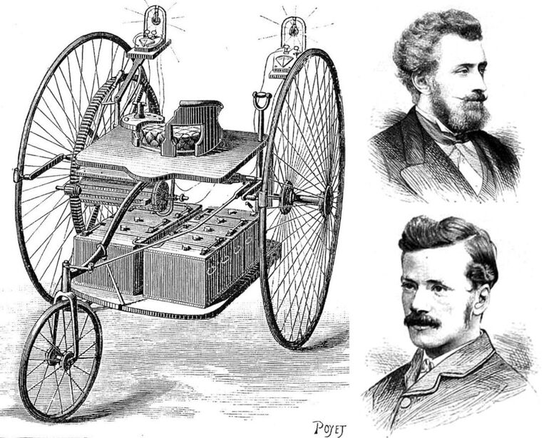 На заставке — первый в мире электромобиль и его авторы: Вверху — Айртон, внизу — Перри. Гравюры из журнала Engineering за 1882 год.