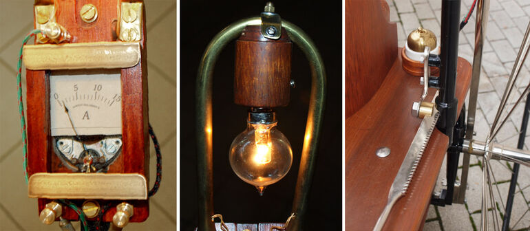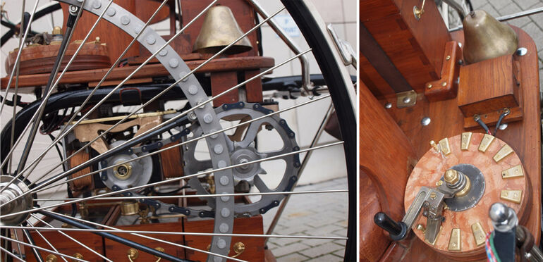 Слева — система передачи крупным планом; справа — контроллер, регулирующий подачу тока к мотору, и, соответственно, — скорость движения. За ним — электрический звонок с колокольчиком, игравший роль клаксона.