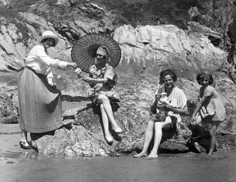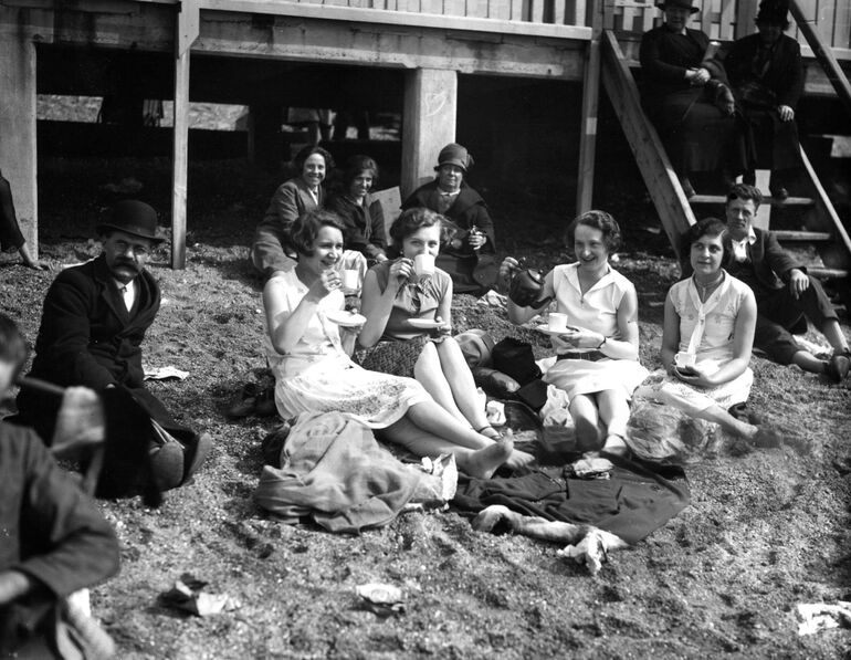 1921. Купающиеся наслаждаются чашкой чая на пляже в Плимуте, Девон