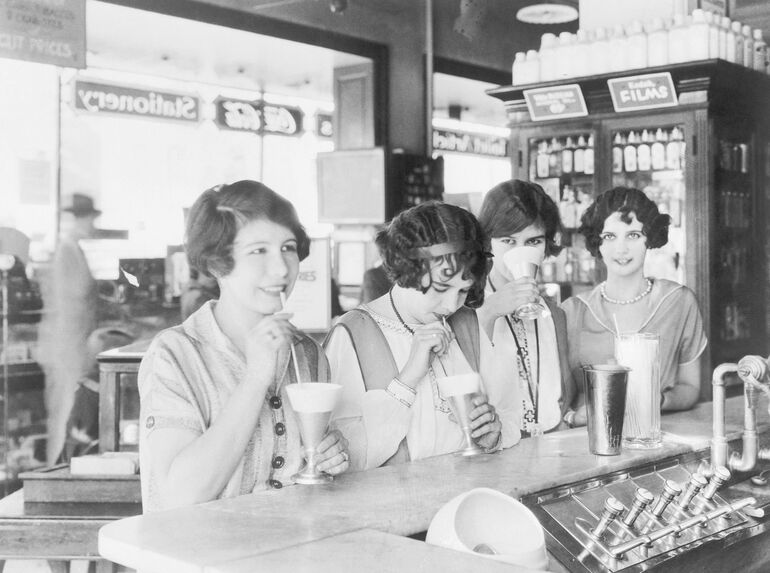 1926. Девушки-флэпперши пьют молочные коктейли в кафе-мороженом