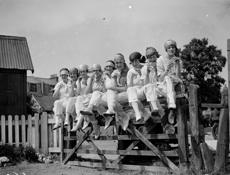 1927. Девушки-крикетистки в пижамах отдыхают от игры и пьют напиток, сидя на пятистворчатых воротах.