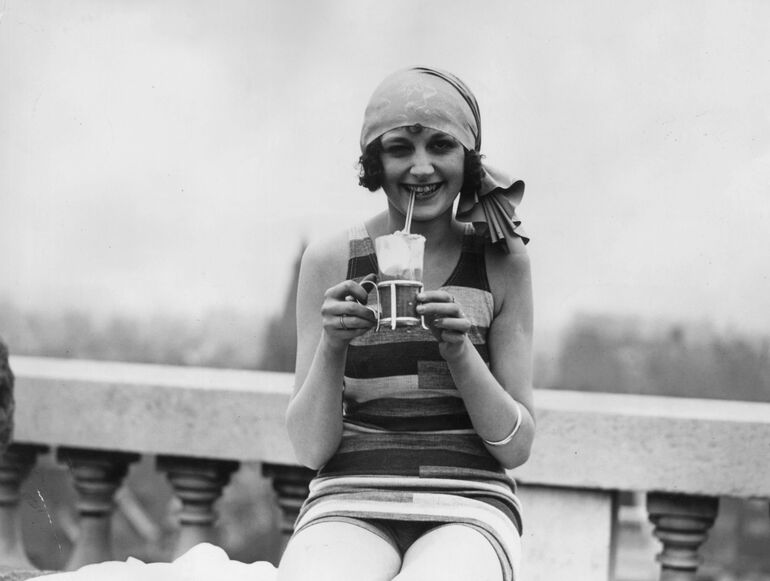 1928. Девушка в купальнике демонстрирует его на крыше универмага на Оксфорд-стрит, наслаждаясь прохладительным напитком