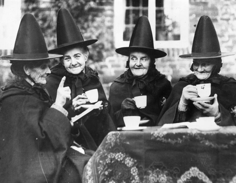 1929. Четыре пожилые женщины в платьях эпохи Якова I пьют послеобеденный чай в Госпитале Святой и Неразделенной Троицы в замке Райзинг, Норфолк