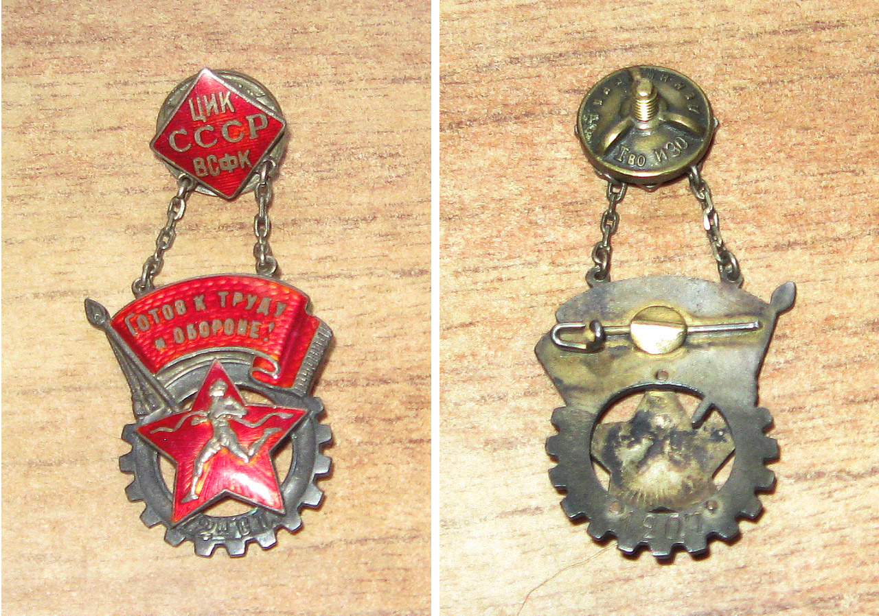 Наверху — значок №1207, принадлежавший моему деду Федору Никитовичу Черемухину. К сожалению, удостоверение не сохранилось и булавка сломана.