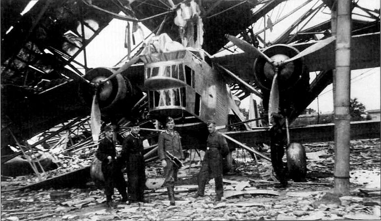 Финита ля трагедия: немцы позируют в разрушенном ангаре на фоне уничтоженного "Дорифора".