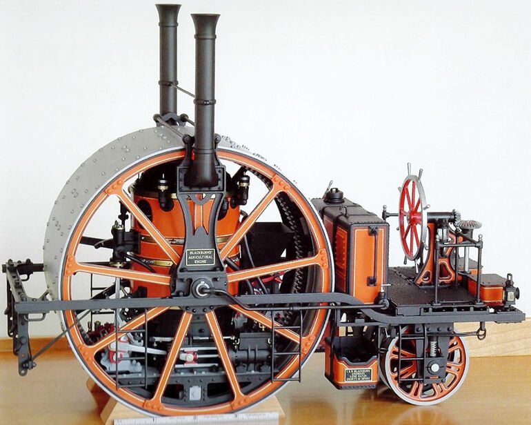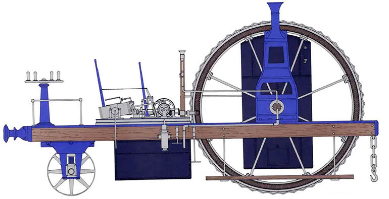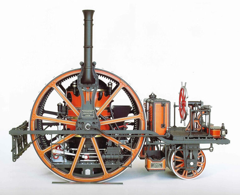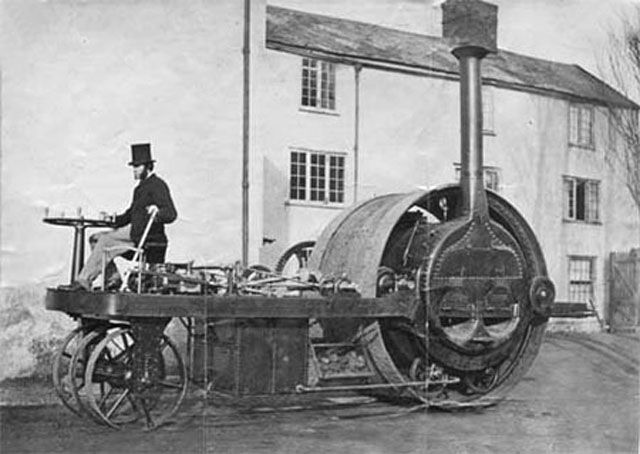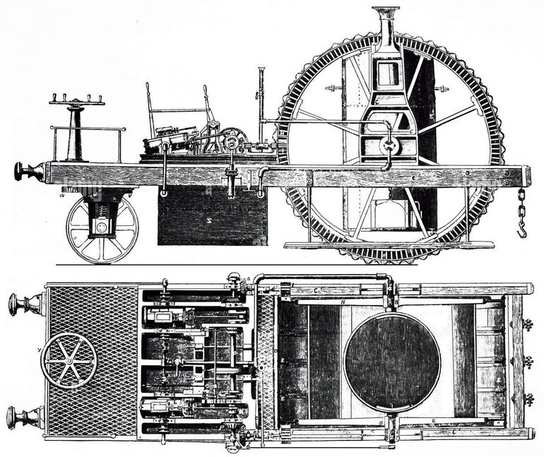 Я имею в виду потрясающий паровой трактор братьев Айзека и Роберта Блэкборн из Эдинбурга, запатентованный в 1857 году. Этот самоходный монстр имел всего одно, зато огромное ведущее колесо-каток, внутри которого располагалась двухцилиндровая паровая машина, а также — топка и паровой котел! Спереди, на платформе находилось рабочее место рулевого со штурвалом, а под ним — три маленьких, сблокированных на одной оси рулевых колесика.