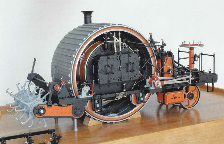 Модель третьего образца, вид со стороны топок. Судя по всему, во время движения машины кочегар должен был идти пешком рядом с ней и на ходу подбрасывать уголь. Чертовски оригинальное техническое решение. Сзади к трактору прикреплен опускаемый культиватор почвы